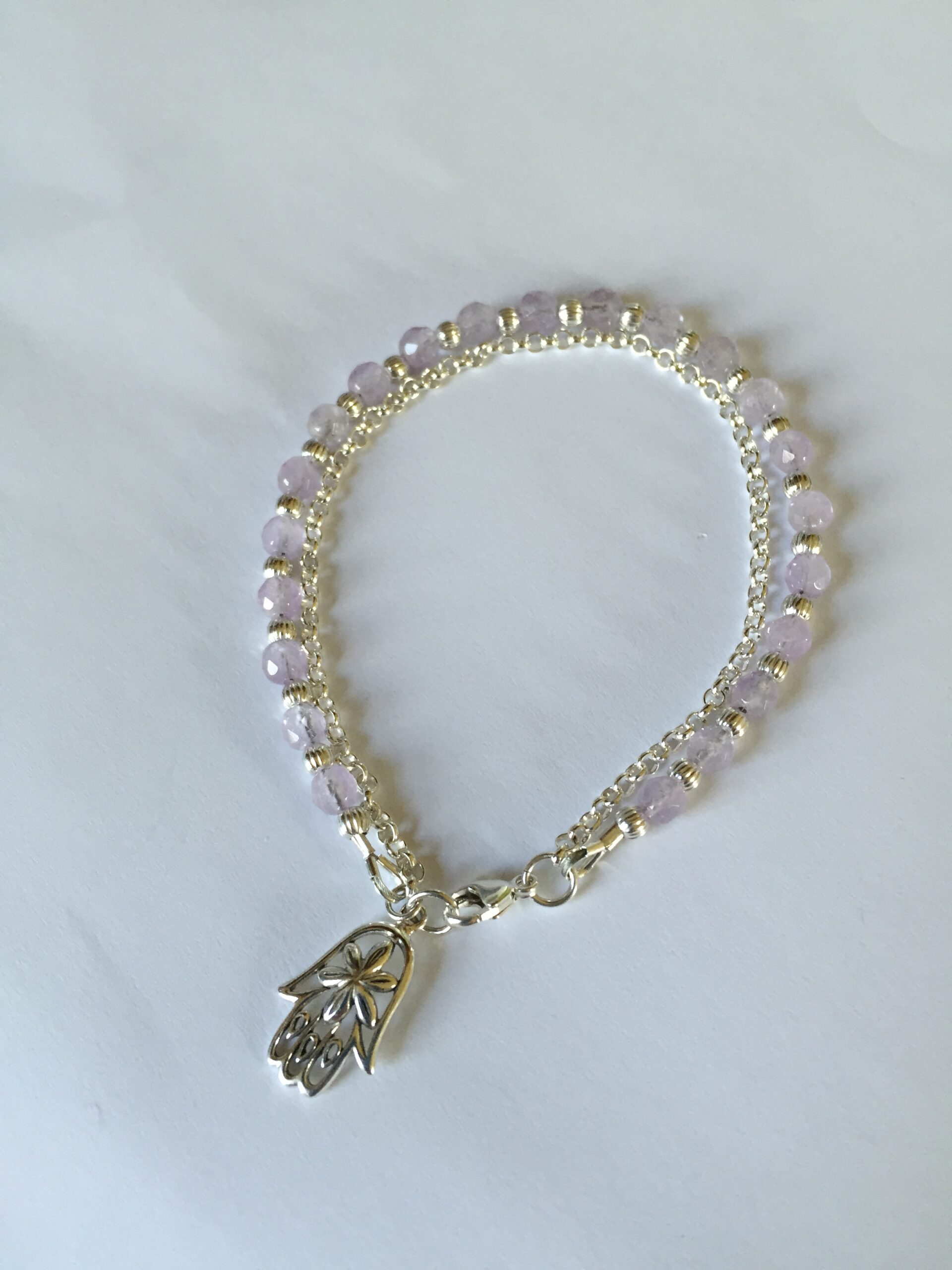 Perfect for layering into your bracelet collection, this lovely bracelet design features faceted lavender amethyst gemstones with a meaningful hand of hibiscus charm, set in sterling silver. Â This beautiful bracelet’s charm represents the hand, a beautiful symbol of protection, now even more exquisite with the added decorative hibiscus flower. Long a sign of femininity, this five petal flower is a classic.