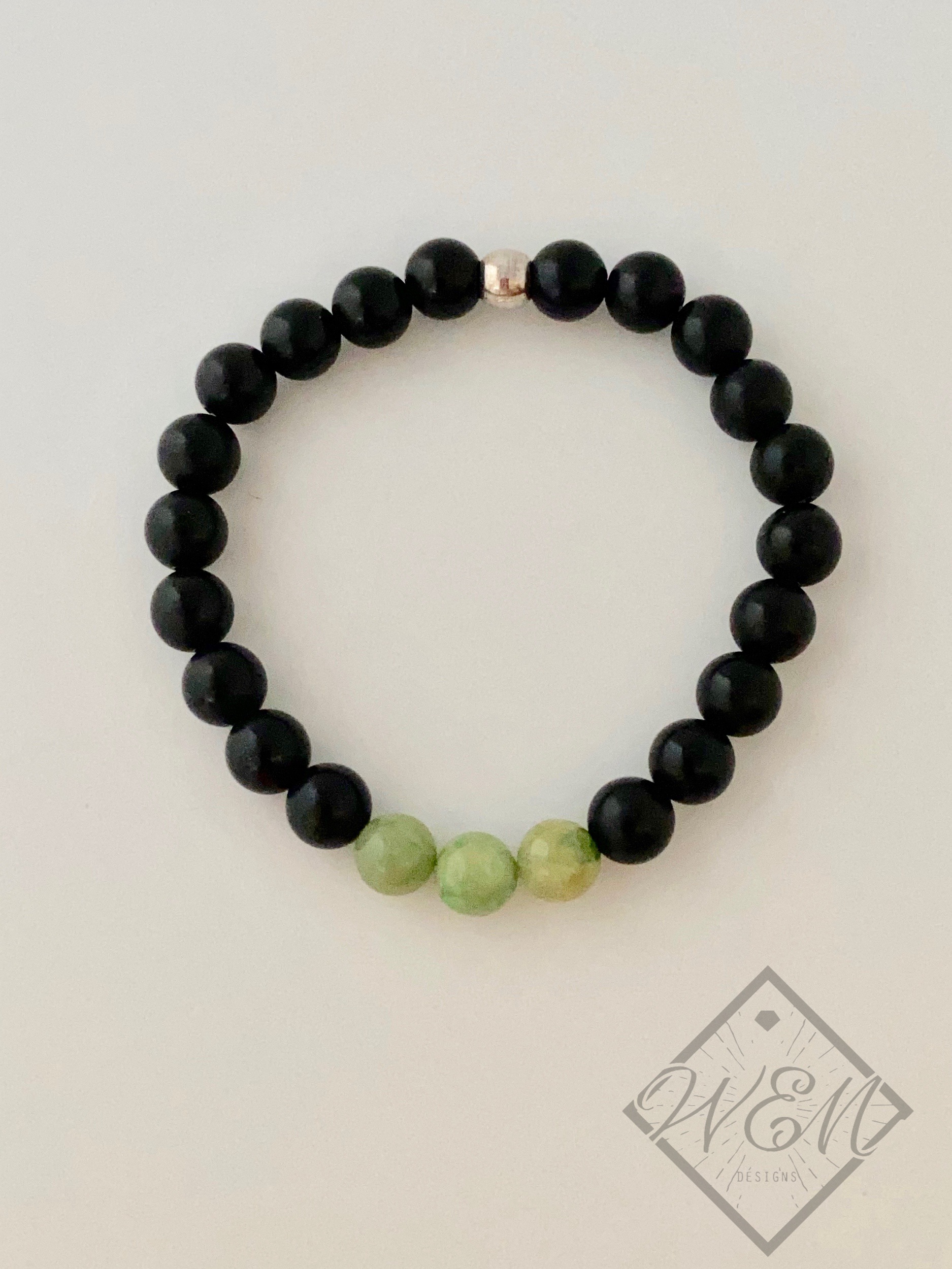 Perfect addition to your bracelet collection, this handsome stretch bracelet features round matte black onyx gemstones and showcases three olivine gemstones with a silver bead.