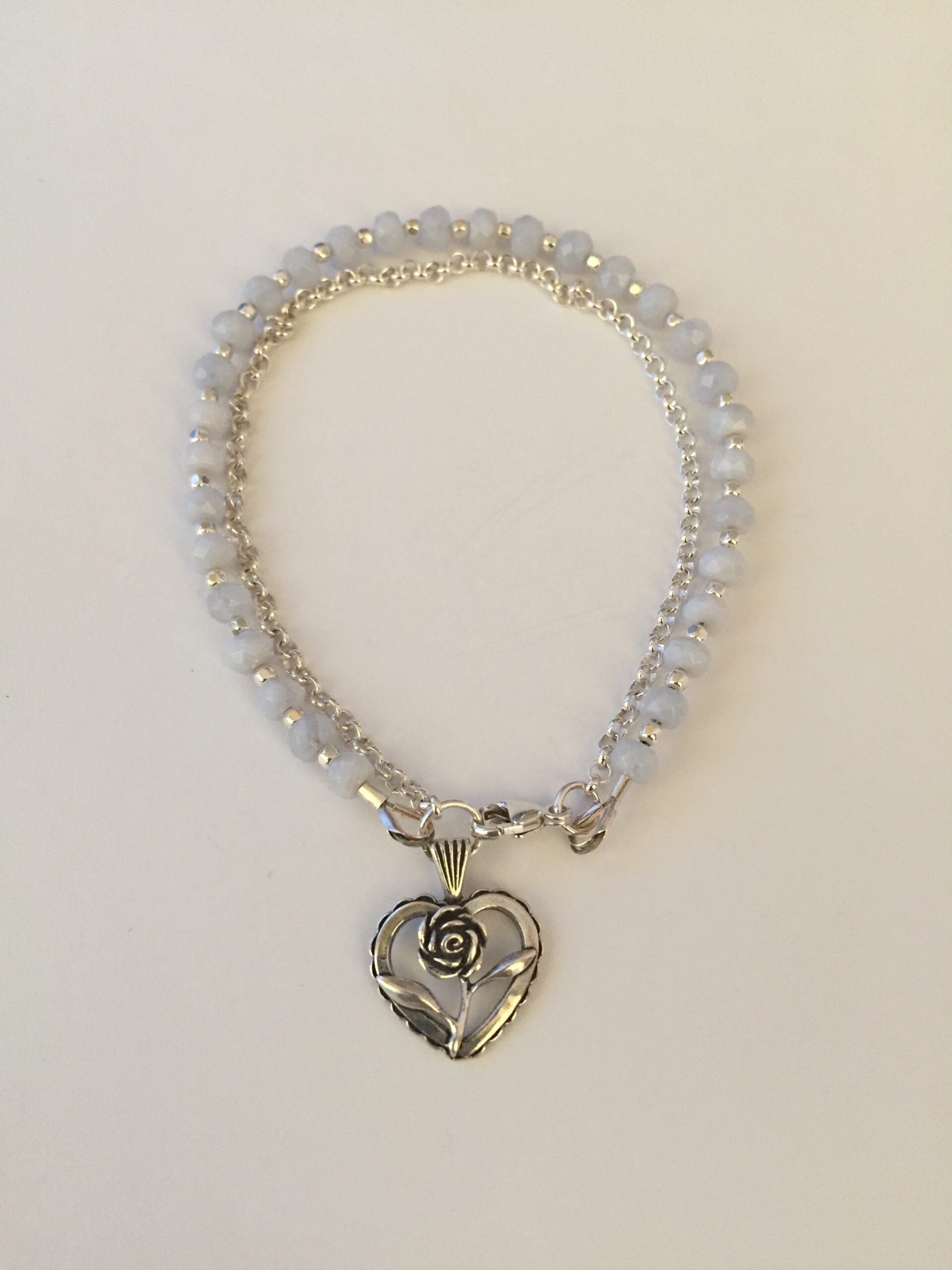 Perfect for layering into your bracelet collection, this lovely bracelet design features faceted blue chalcedony gemstones with a vintage flower heart charm, set in sterling silver.