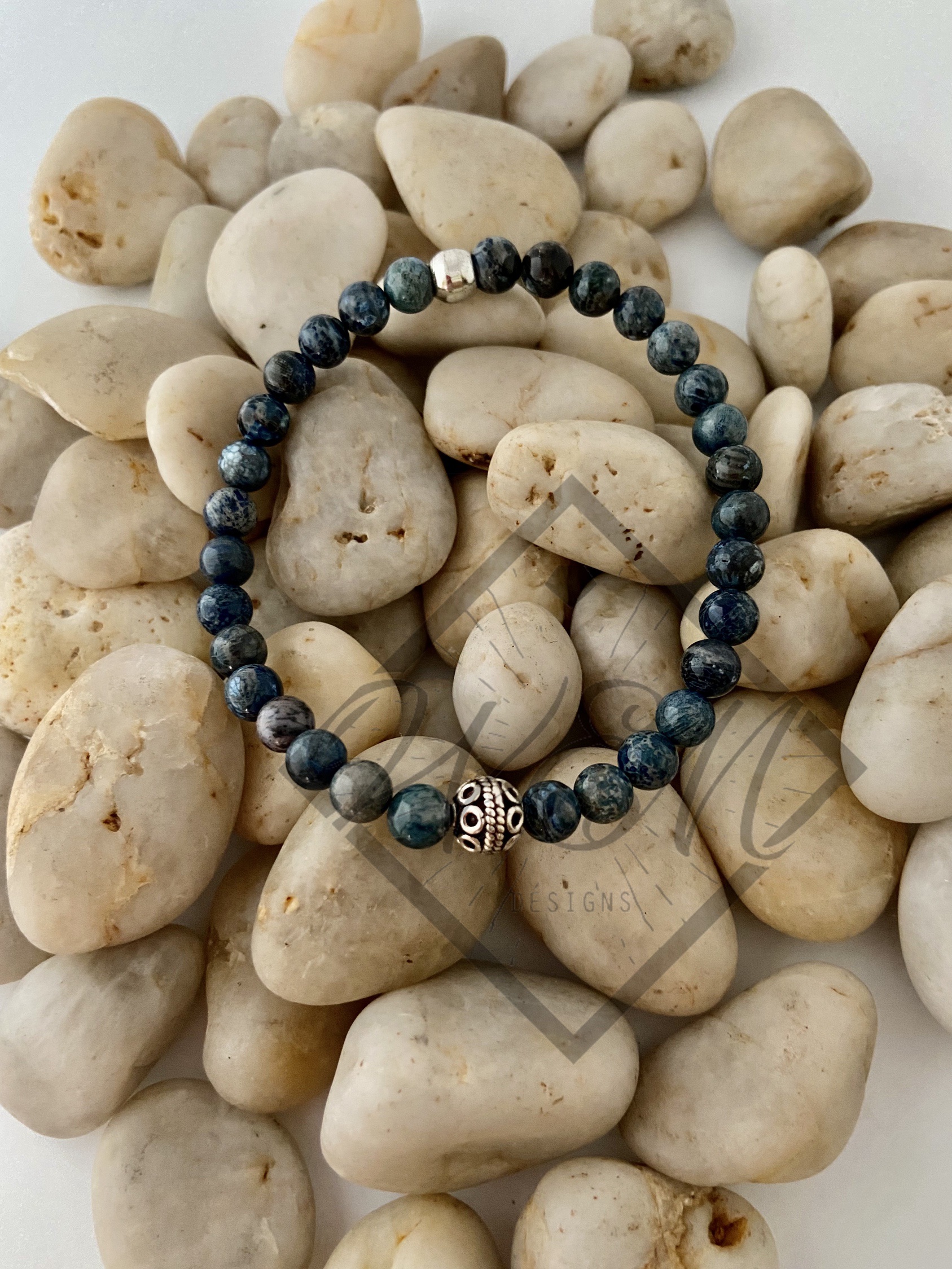 Perfect addition to your bracelet collection, this stylish Aaron stretch bracelet features sunset dumortierite gemstones, showcasing light blue, lapis blue to cobalt, as well as some occurrences of dark gray. It is an aluminum borosilicate mineral that varies in color from blue, green and brown to the the more rare violet and pink. Wear this to bring you water energy and promote flow, control and orderliness. Â Accented with a sterling silver Bali bead.