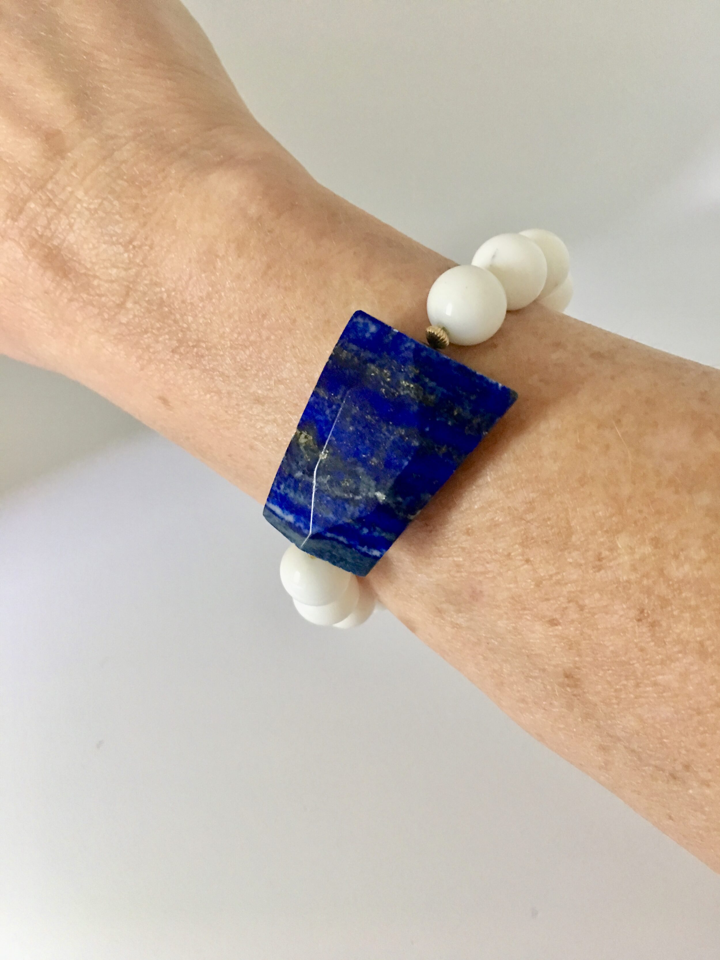 Perfect for layering into your bracelet collection, this stretch bracelet design features round white agate gemstones and showcases a large blue lapis. This lovely bracelet’s white agate gemstones represent the ‘Stone of New Life’, comforts and fills the being with pure, loving and nurturing energies. Â Add a large Blue Lapis and you have a symbol of royalty and honor, gods and power. Â It is the universal symbol of wisdom and truth. Â Wear it daily to remind you of your intention. Â Give as a gift and include a personal note to express your intention in giving this handmade gift. Â Marry it with the landscape patterns of other healing bracelets and you have a roadmap for life.