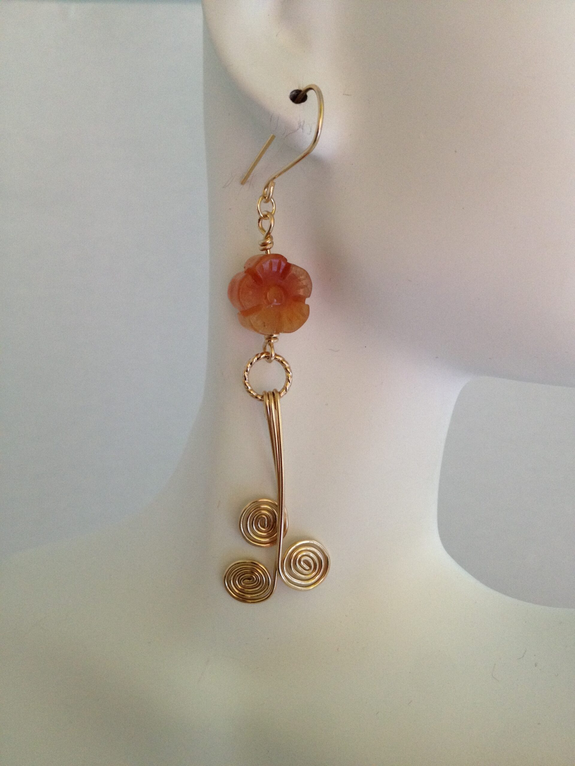 These long gold earrings feature a carnelian gemstone in a flower petal design.  Showcasing intricately handcrafted  stems hammered with a textural swirl like pattern.  With handmade French style ear wires, these pretty gold earrings are unique and lovely.