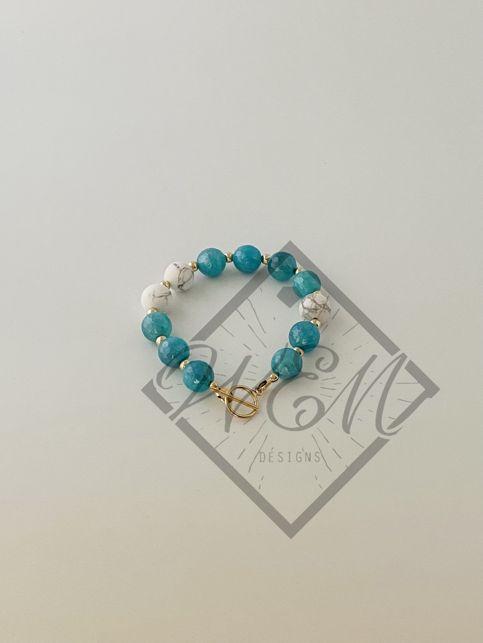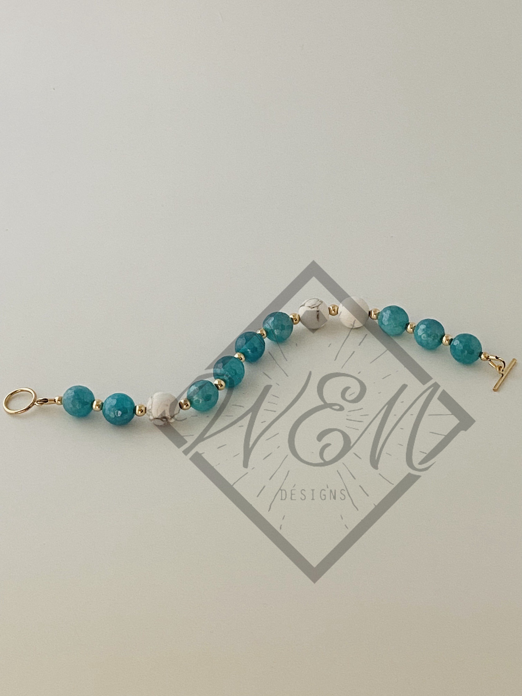 A perfect addition to your bracelet collection, this lovely bracelet design features (dyed) jade gemstones showcasing matte white howlite gemstones and a gold toggle clasp for closure.