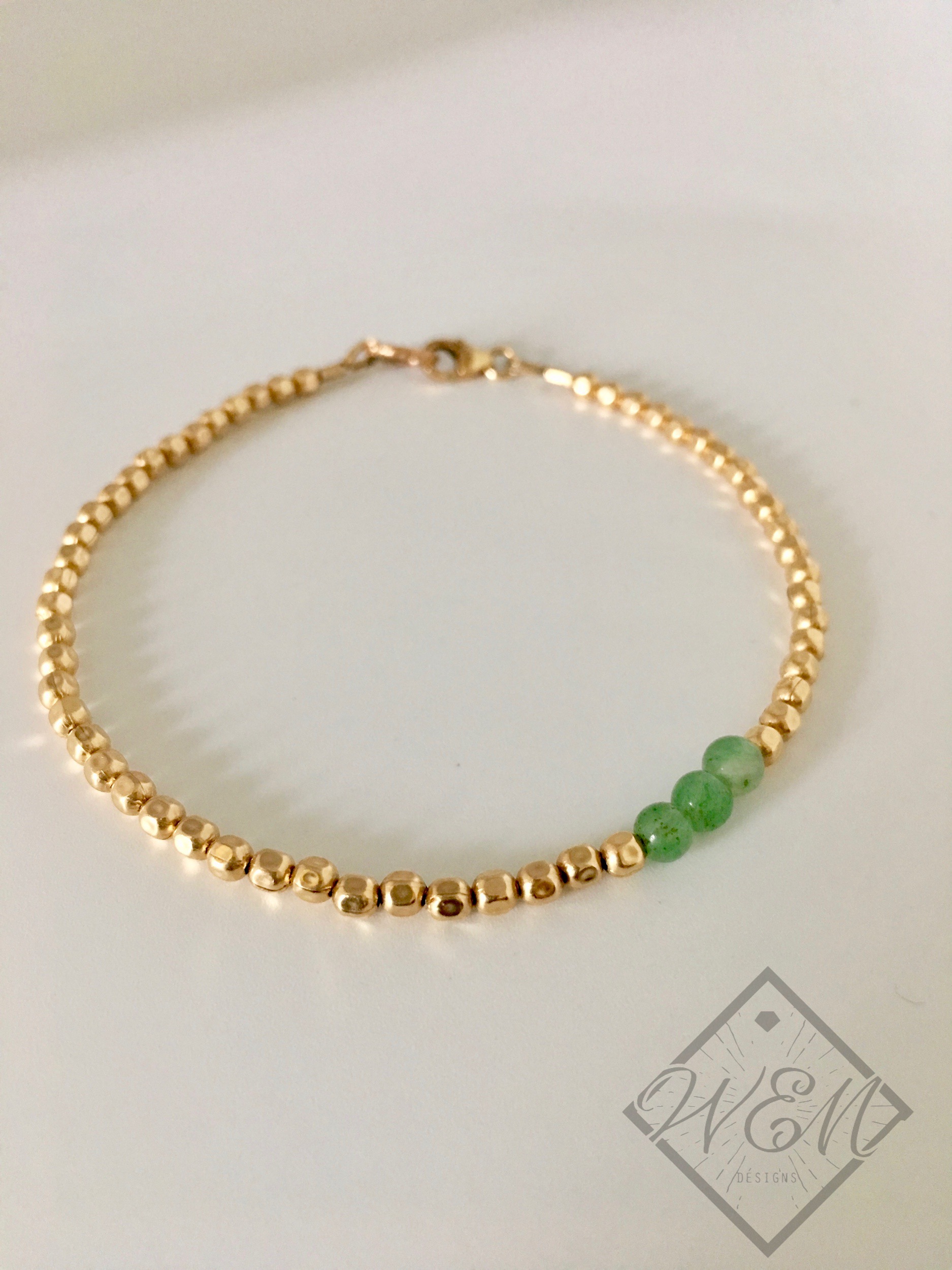 Perfect for layering into your bracelet collection, this lovely bracelet design features three round aventurine gemstones handcrafted with 14K yellow gold filled nuggets.