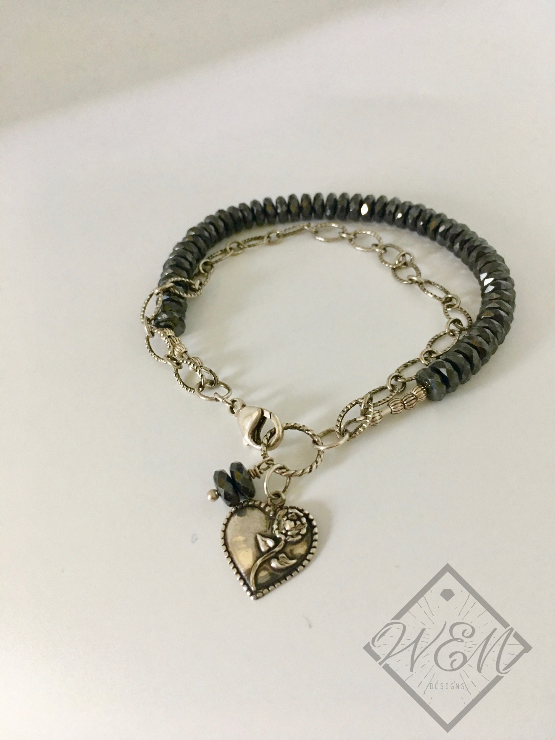 Perfect for layering into your bracelet collection, this lovely bracelet design features faceted hematite gemstones handcrafted with a vintage sunflower heart charm, set in sterling silver.