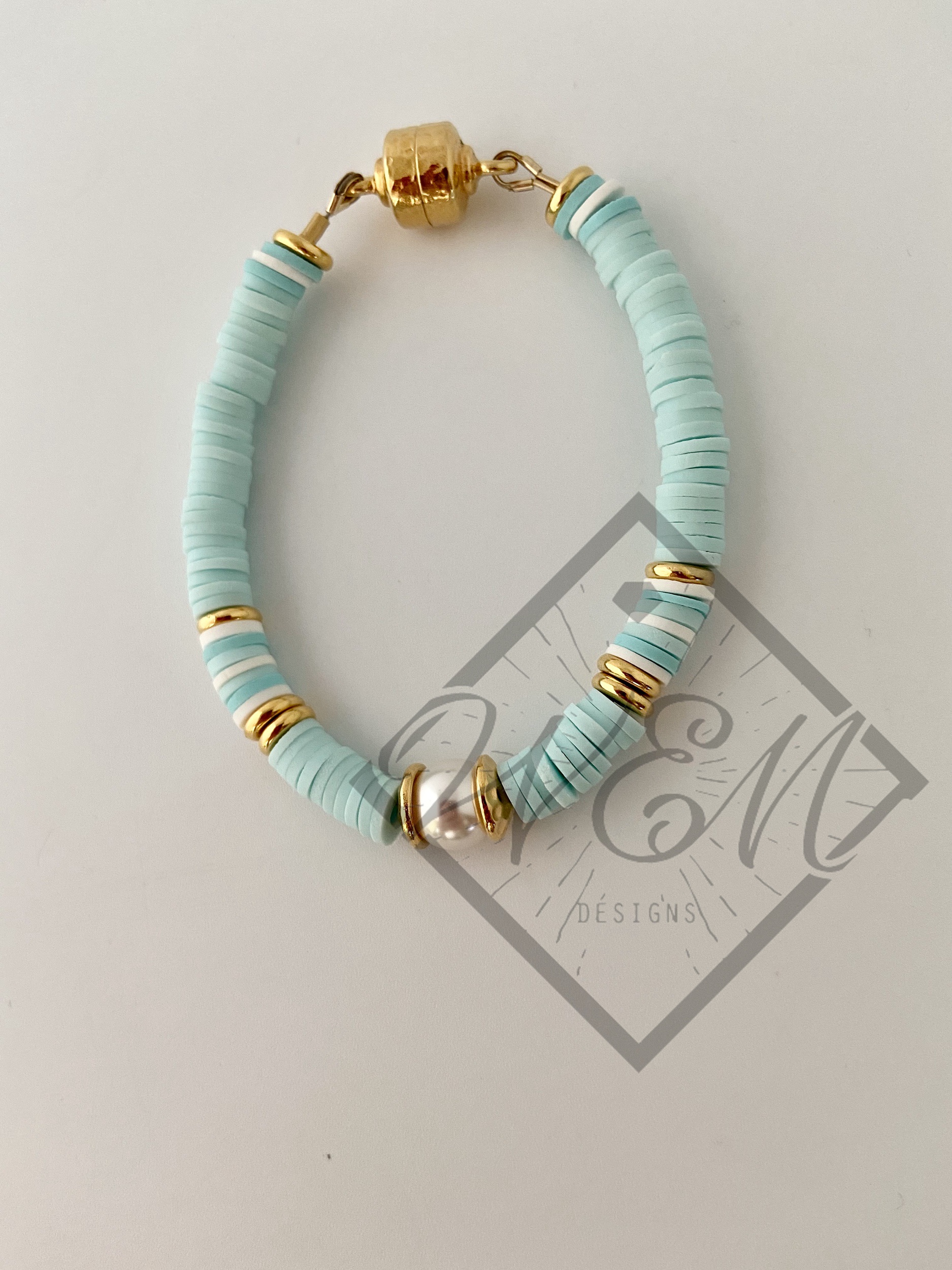 Perfect for layering into your bracelet collection, this exquisite bracelet design features heishi vinyl beads showcasing a white Swarovski pearl with a magnetic clasp for closure.