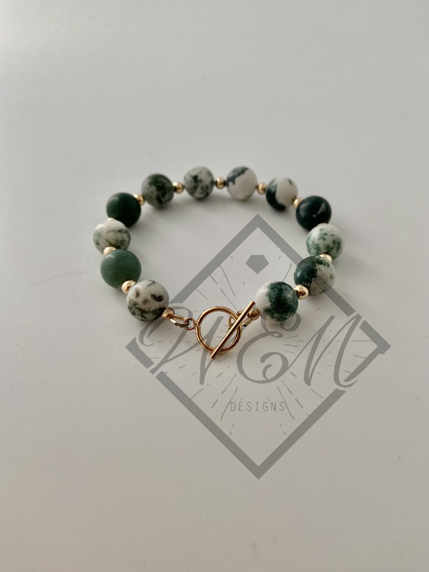 A perfect addition to your bracelet collection, this lovely bracelet design features matte tree agate gemstones interspersed with 14k yellow gold filled beads and a toggle clasp.