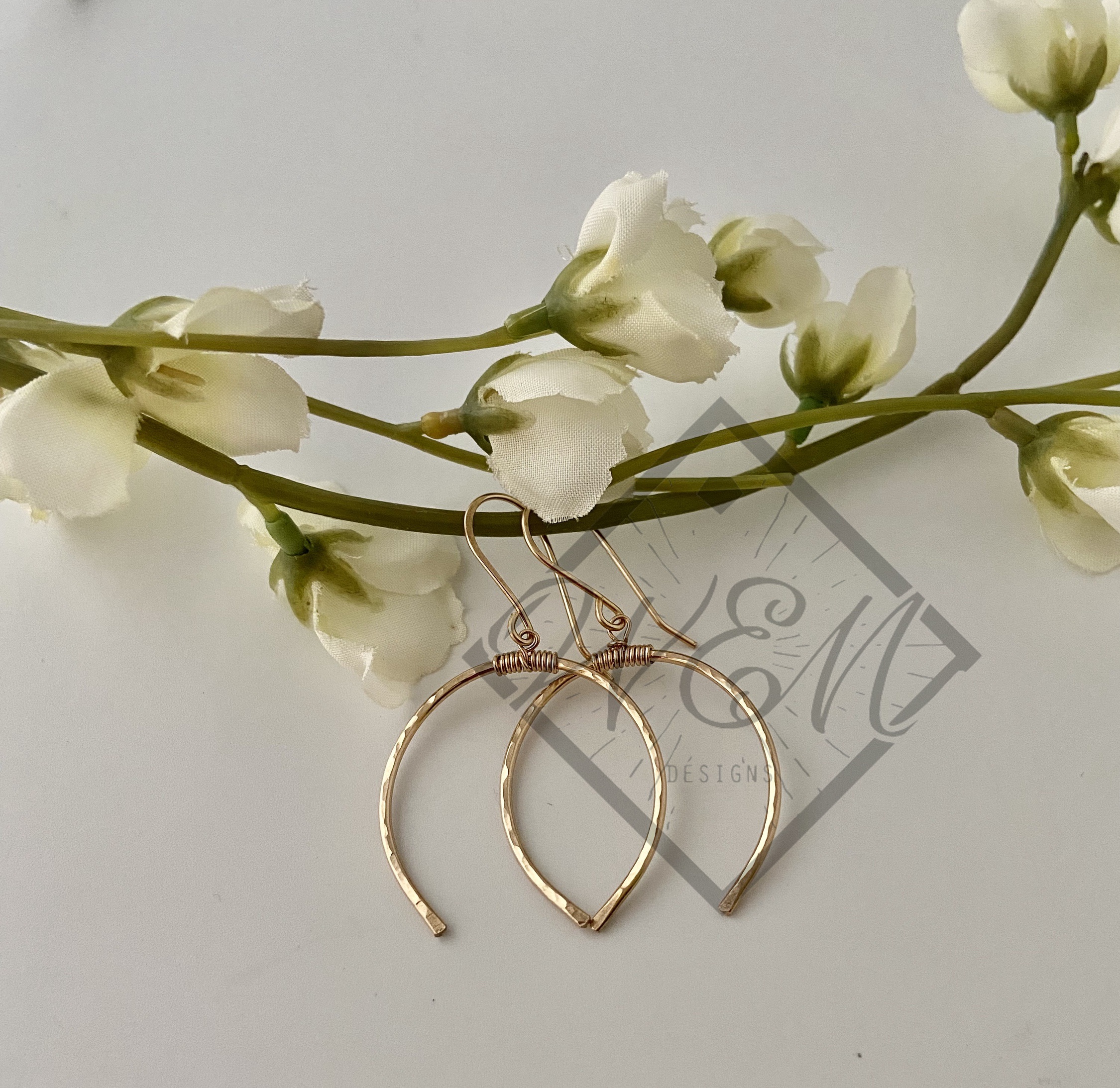 The perfect addition to your jewelry collection, these lovely semi-open dangle hoop earrings are lightweight without compromising on quality, handcrafted from 14k yellow gold filled wire. Â With a French style ear wire, these dangle earrings feature a hammered textural design, perfect for everyday wear.