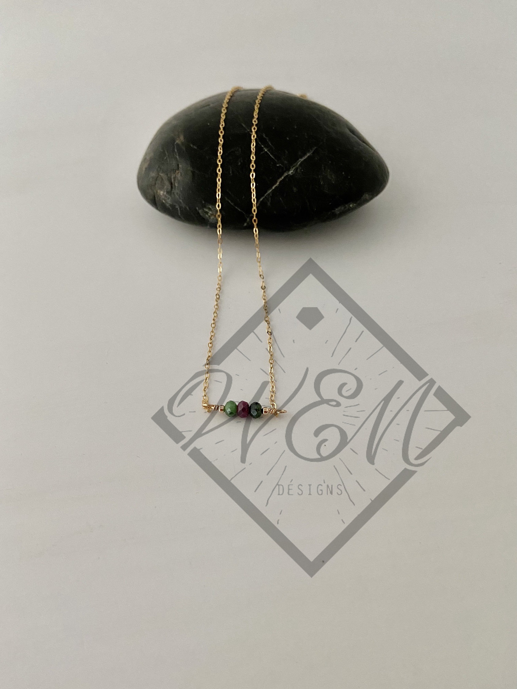 Three, eye-catching ruby zoisite gemstones take centerstage in this Georgia necklace bringing vibrant color and depth. Â Instantly striking, wear to bring added interest to your look whether as a stone-alone statement or layered with other WEM Design necklaces. Â Handcrafted from 14k yellow gold filled, this necklace catches the light beautifully.