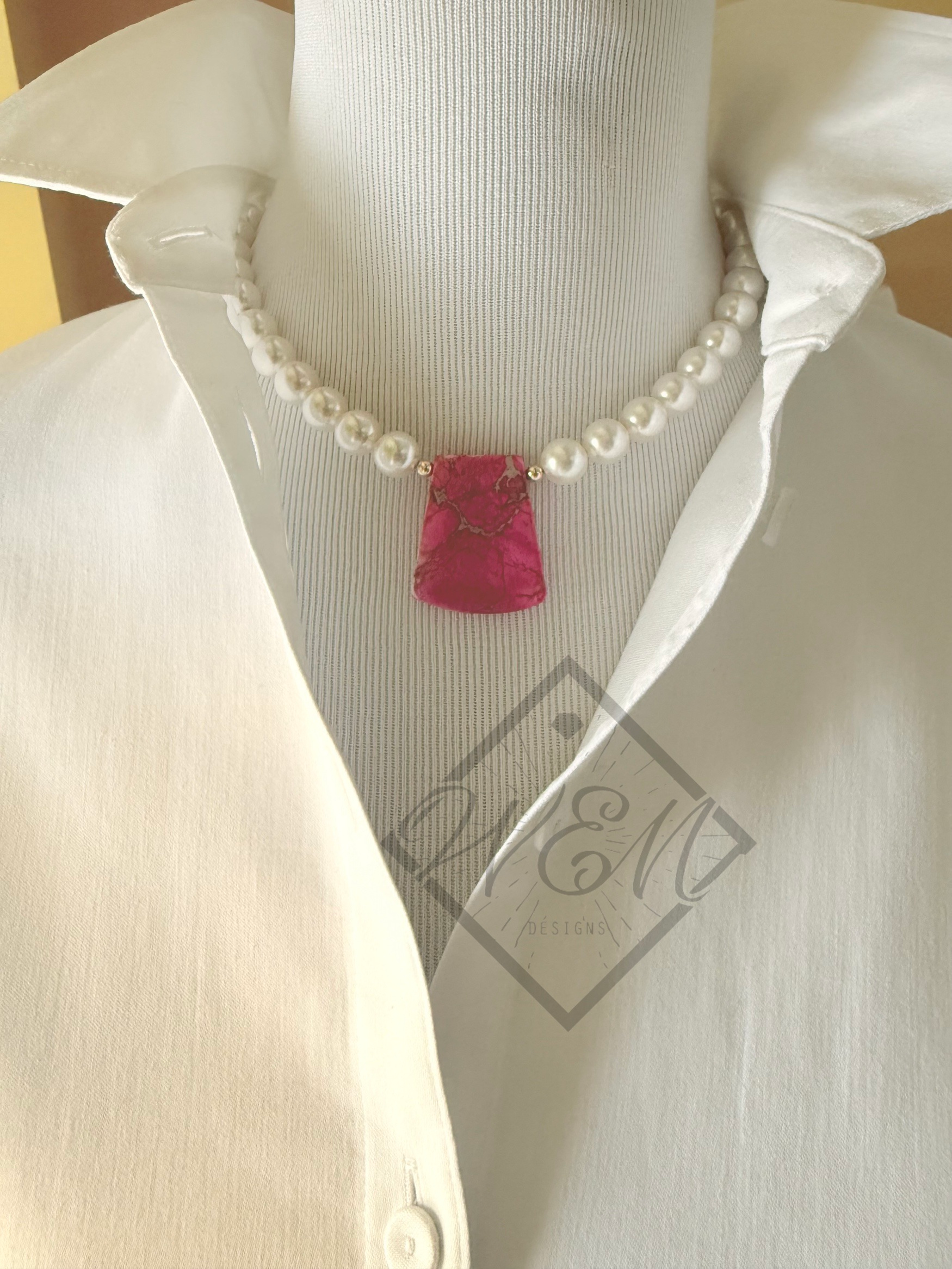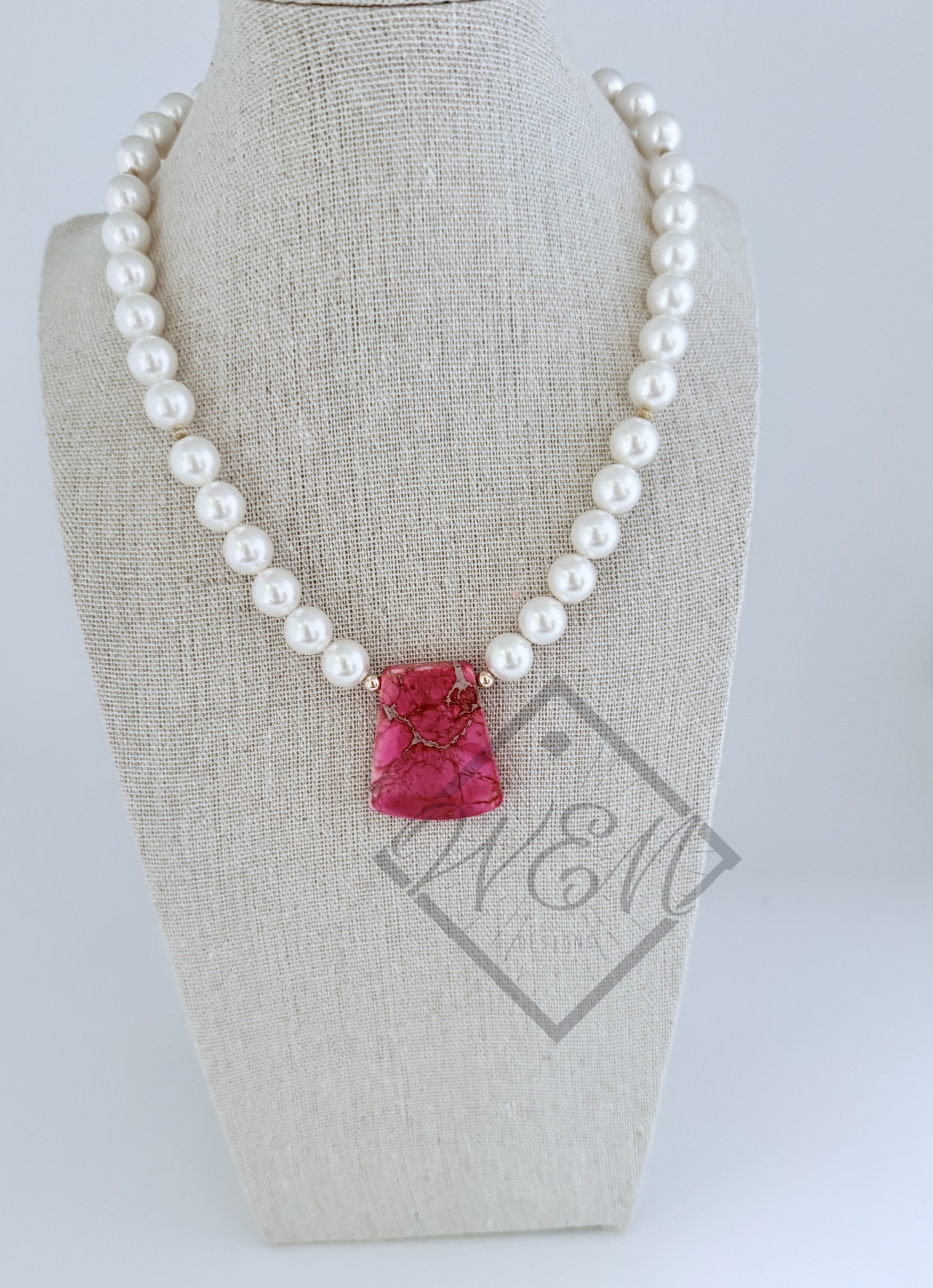 Perfect addition to your jewelry collection, this beautifully handcrafted necklace features bright white Swarovski pearls showcasing a red impression jasper gemstone with veins of light grey and subtle tans and 14k yellow gold filled beads scattered throughout. A bold and vibrant accessory for uniquely you.